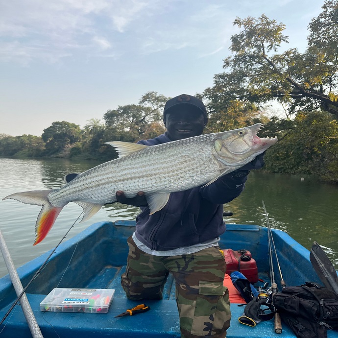 This is the experience of a lifetime for the adventurous. Hard fighting and acrobatic, Tiger Fish are on every angler’s bucket list. The good and little-known news is they are here in the freshwater reaches of the Gambia River. The scenery is spectacular and wild. If you don’t want to go fishing, we can help arrange your trip anyway. The banks abound with diverse flora and wildlife including Colobus Monkeys, Guinea Baboons, Callithrix Monkeys, and amazing birdlife including Bateleur Eagles, African Fish Eagle, African Harrier Hawk, Vultures, Egyptian Plover, Spur Winged Geese, White-Faced Whistling Ducks, Cranes, African Finfoot, Parrots, Oriole Warbler, Bee-eaters etc. The tackle is moderate to hard action spinning rods with 30-40lb braided line. You can expect to see hippos, monitor lizards, crocodiles, and freshwater tortoise. If lucky you might see Warthog and Antelope. An additional day can be included to visit the River Gambia National Park (Baboon Island) where you can see Chimpanzees in the wild – or replace the fishing with this. Tactics include trolling with lures, live and dead baiting. Allow the captain to handle the fish when landed and unhooked. Tiger Fish are notoriously hard to hook – the captain is tried and tested and knows what he’s doing to maximize hook ups. We recommend three full days for this trip including two overnights at a basic but comfortable and clean river side camp – Bansang (if available) is more comfortable than current Janjanbureh options. Other species that can be targeted include Vundu Catfish and African Pike.